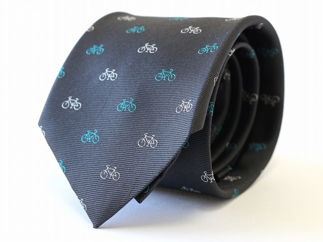 チャコールグレーベースにターコイズグリーンと白の自転車柄ネクタイ★